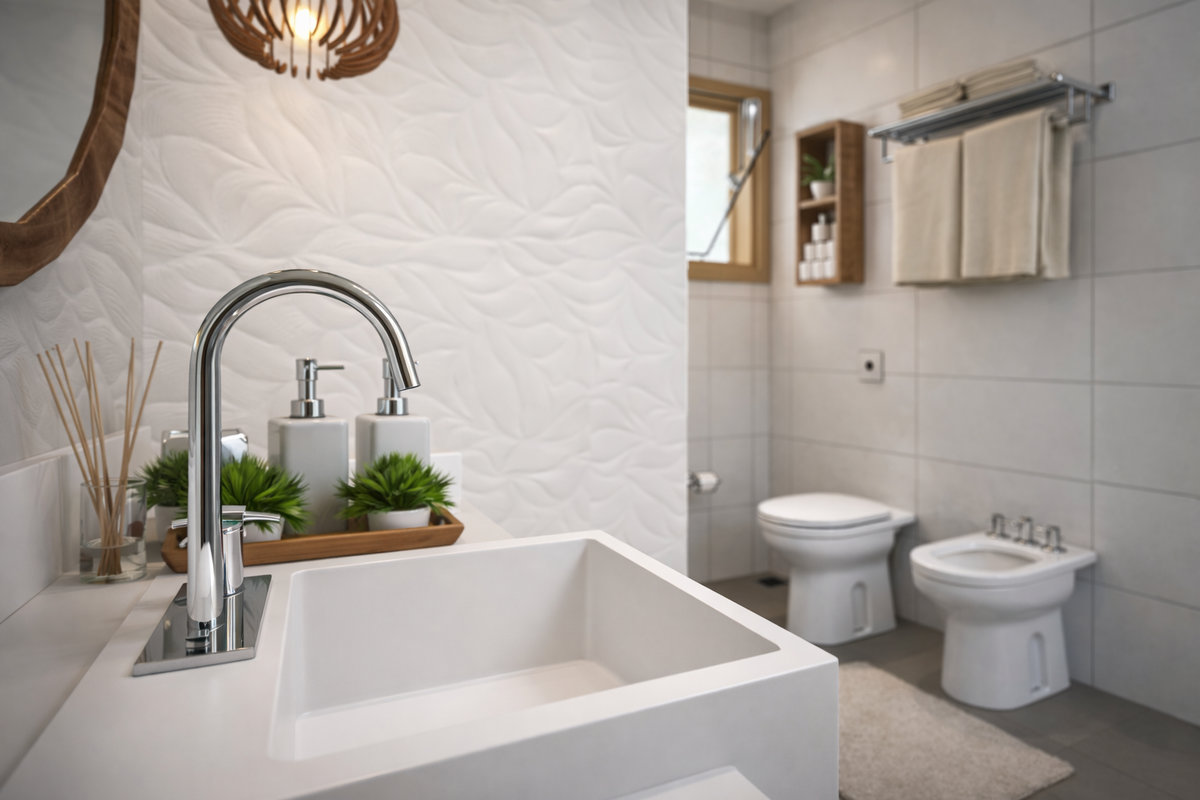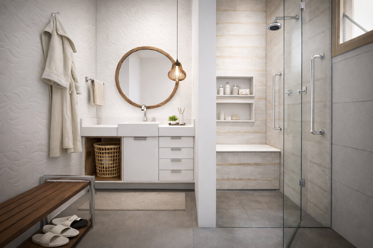 A área de banho foi projetada com piso antiderrapante, barra de apoio e banco de banho, proporcionando maior estabilidade e conforto no uso diário. O vaso sanitário em altura adequada, a bancada com cuba de apoio posicionada corretamente e as portas amplas — tanto do box quanto da entrada do ambiente — contribuem para uma circulação segura e funcional.