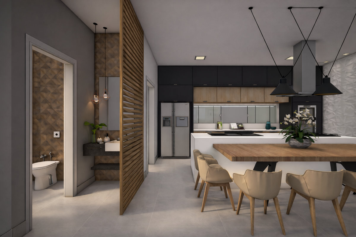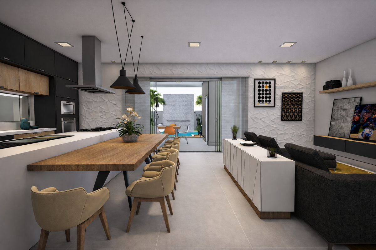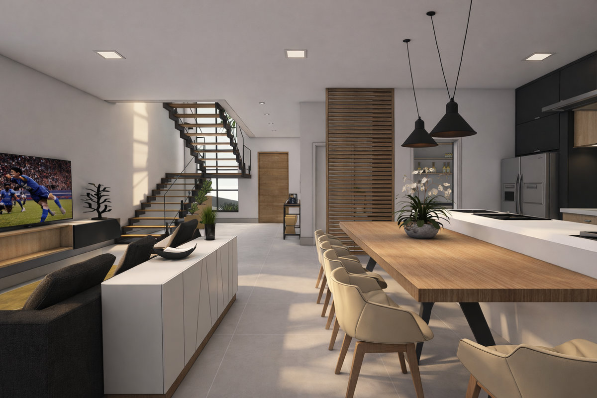 Já no pavimento térreo, a área social foi pensada de forma integrada, conectando salas, cozinha e área de lazer para criar um ambiente amplo, fluido e convidativo. Elementos como a escada vazada e o muxarabi se destacam não apenas pela função, mas também pelo valor estético, trazendo leveza, elegância e personalidade ao projeto.