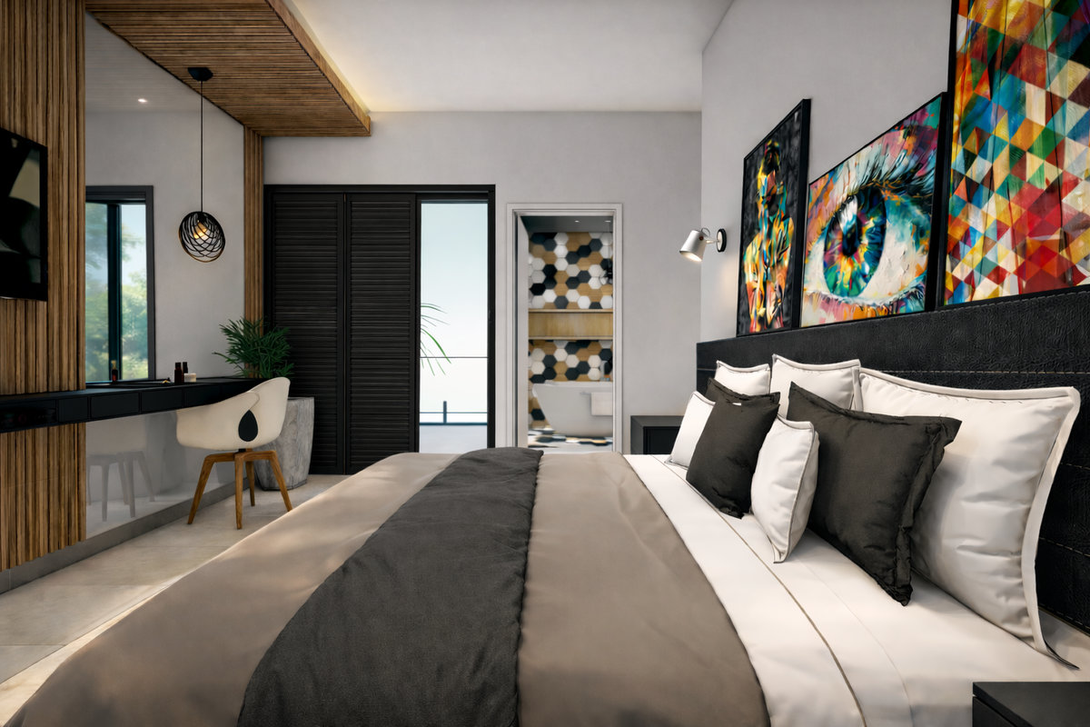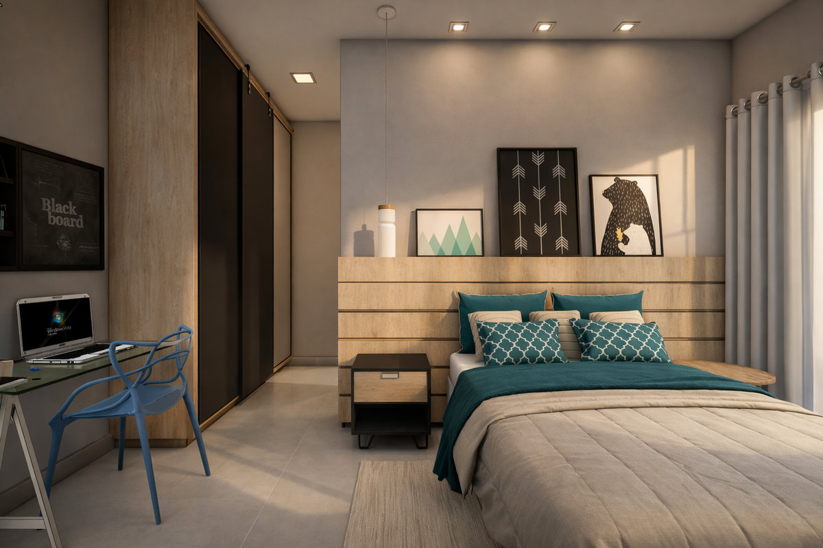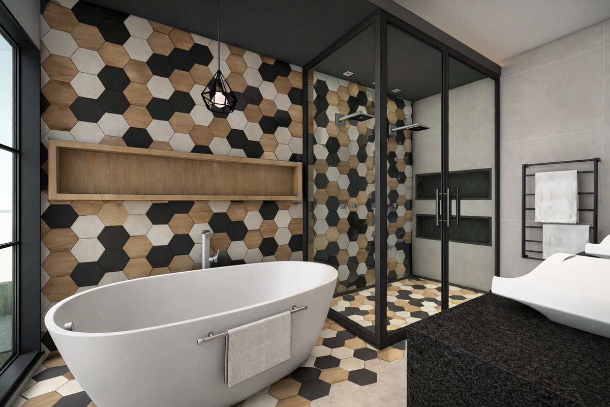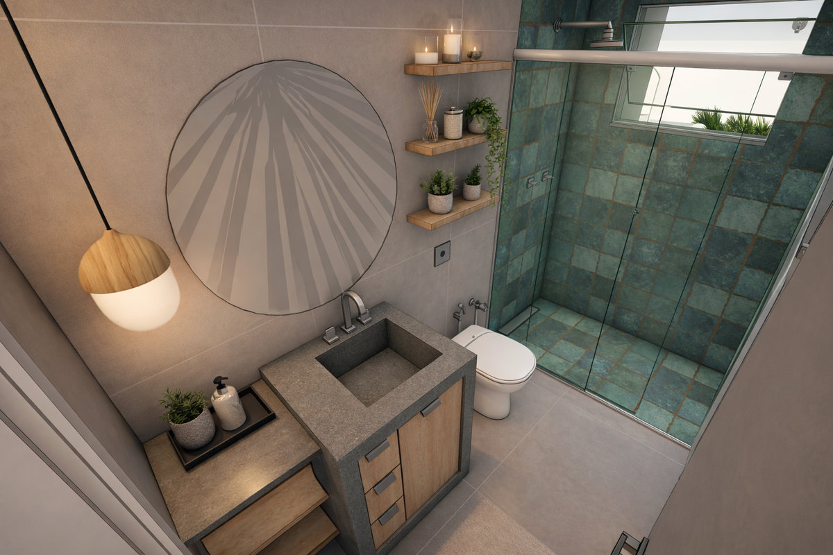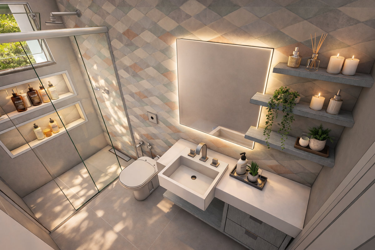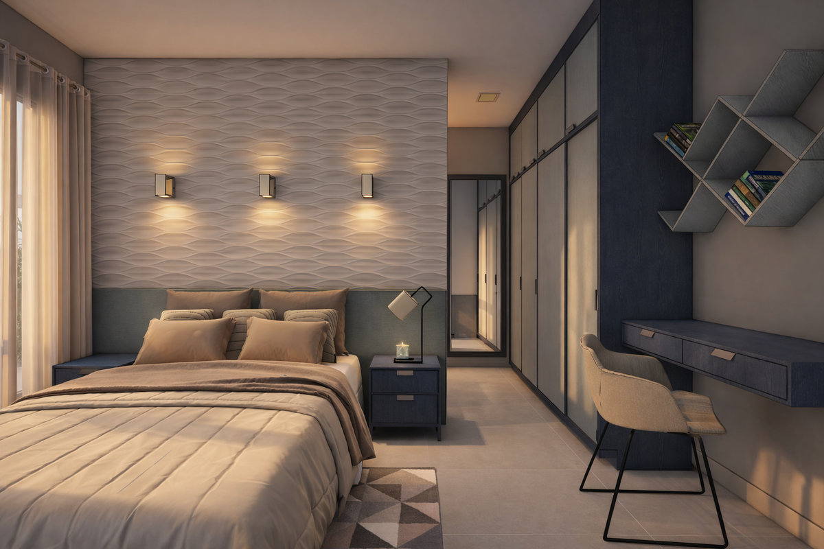 No pavimento superior, concentram-se os ambientes íntimos, com três suítes que garantem privacidade e conforto aos moradores. O destaque fica para a suíte master, que conta com uma banheira de imersão integrada à área de banho, envolta por um revestimento hexagonal que confere identidade e sofisticação ao espaço.